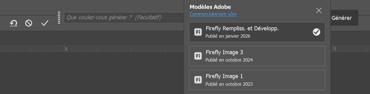 Capture d’écran montrant plusieurs modèles d’intelligence artificielle disponibles dans Photoshop, illustrant le choix entre différentes générations de Firefly et l’évolution continue des modèles proposés par Adobe.